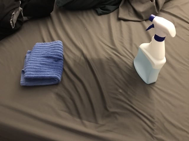 Nệm bông ép khi bị ướt, nhãy dùng cồn 90 độ đổ đều lên chỗ bị ướt rồi đợi khoảng 1-2h sau để cồn bay hết hơi. Các mẹ có thể thấm hút hết chỗ nước mà bé tè rồi sau đó cho dung dịch tinh dầu lên và sấy nệm để giúp việc lau chùi thuận tiện, bạn nên mua tấm lót nệm lót dưới ga để khi bé tè thì bạn chỉ cần giặt ga và tấm lót sẽ dễ dàng hơn nhiều