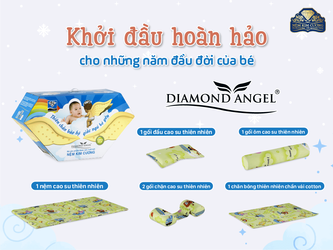 Giắc ngủ ngon chính là khởi đầu hoàn hảo cho sự phát triển vượt bậc của con. Với Diamond Angel, bạn có thể yên tâm bé yêu sẽ luôn được chăm sóc một cách tốt nhất. Hãy trao tặng cho con không chỉ sự quan tâm về mặt dinh dưỡng, mà còn cả sự chăm sóc chu đáo về mặt giấc ngủ. Tìm mua sản phẩm tại hệ thống showroom hoặc đại lý chính hãng của Nệm Kim Cương ngay hôm nay.