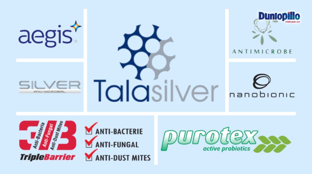 - Talasilver – Sử dụng công nghệ bạc Nano trong quá trình sản xuất nệm cao su tự nhiên nhằm tận dụng khả năng kháng khuẩn và kháng độc tới 99,9% của bạc. Cao su Dunlopillo Talasilver cho khả năng kháng khuẩn tuyệt đối, ngăn chặn tối đa vi khuẩn gia tăng trên bề mặt nệm, giúp bảo vệ và tạo sự thoải mái tối ưu cho người nằm.