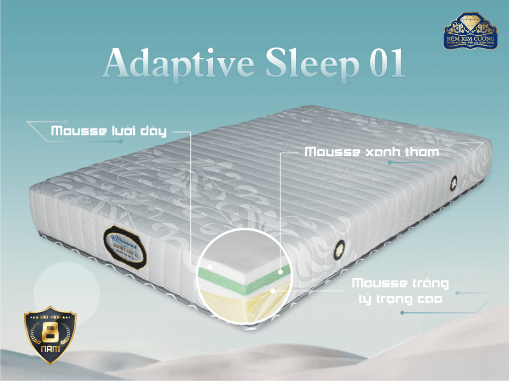 Trân trọng giới thiệu đến bạn, nệm mousse ba tầng Adaptive Sleep 01, sự kết hợp đỉnh cao của công nghệ đa lớp, được thiết kế để mang đến trải nghiệm giấc ngủ hoàn hảo nhất cho bạn. Nệm gồm ba lớp mousse/foam khác nhau, mỗi lớp đều đóng vai trò quan trọng trong việc tối ưu hóa giấc ngủ.